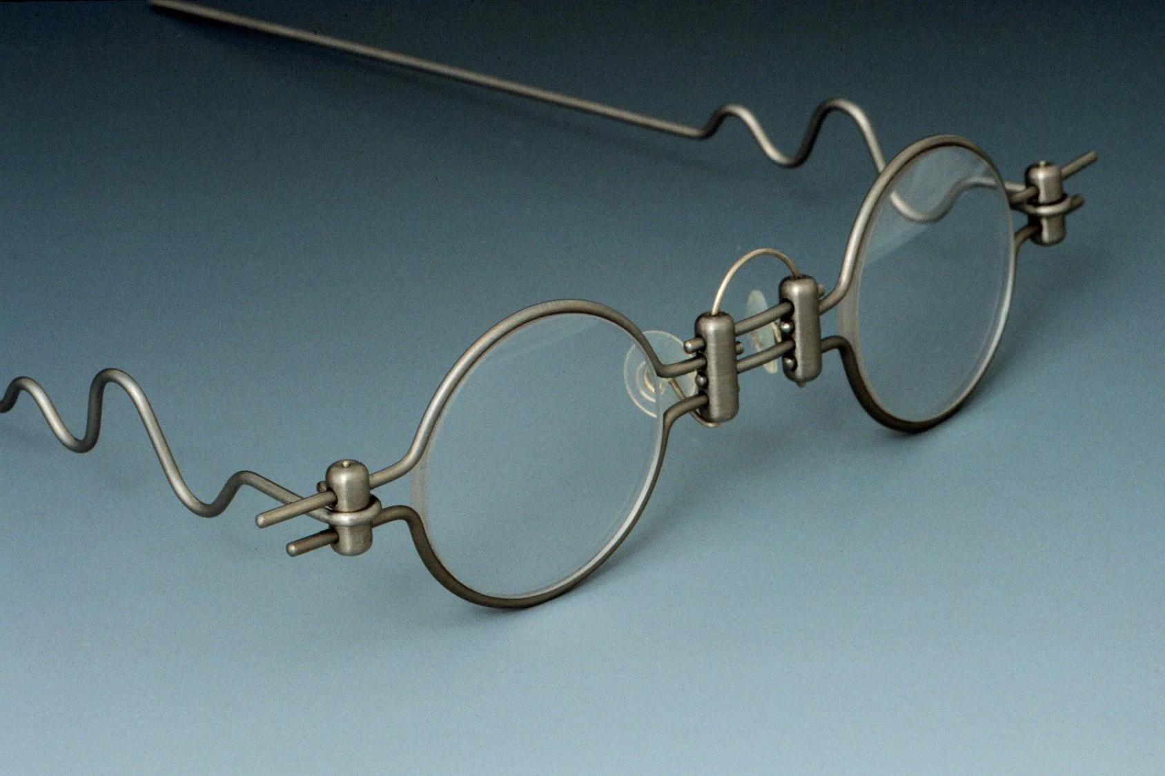 Hot-formed and anodized titanium frame. Polycarbonate lenses. This frame was a custom design for Fred Fenster, my metalsmithing professor at the time.