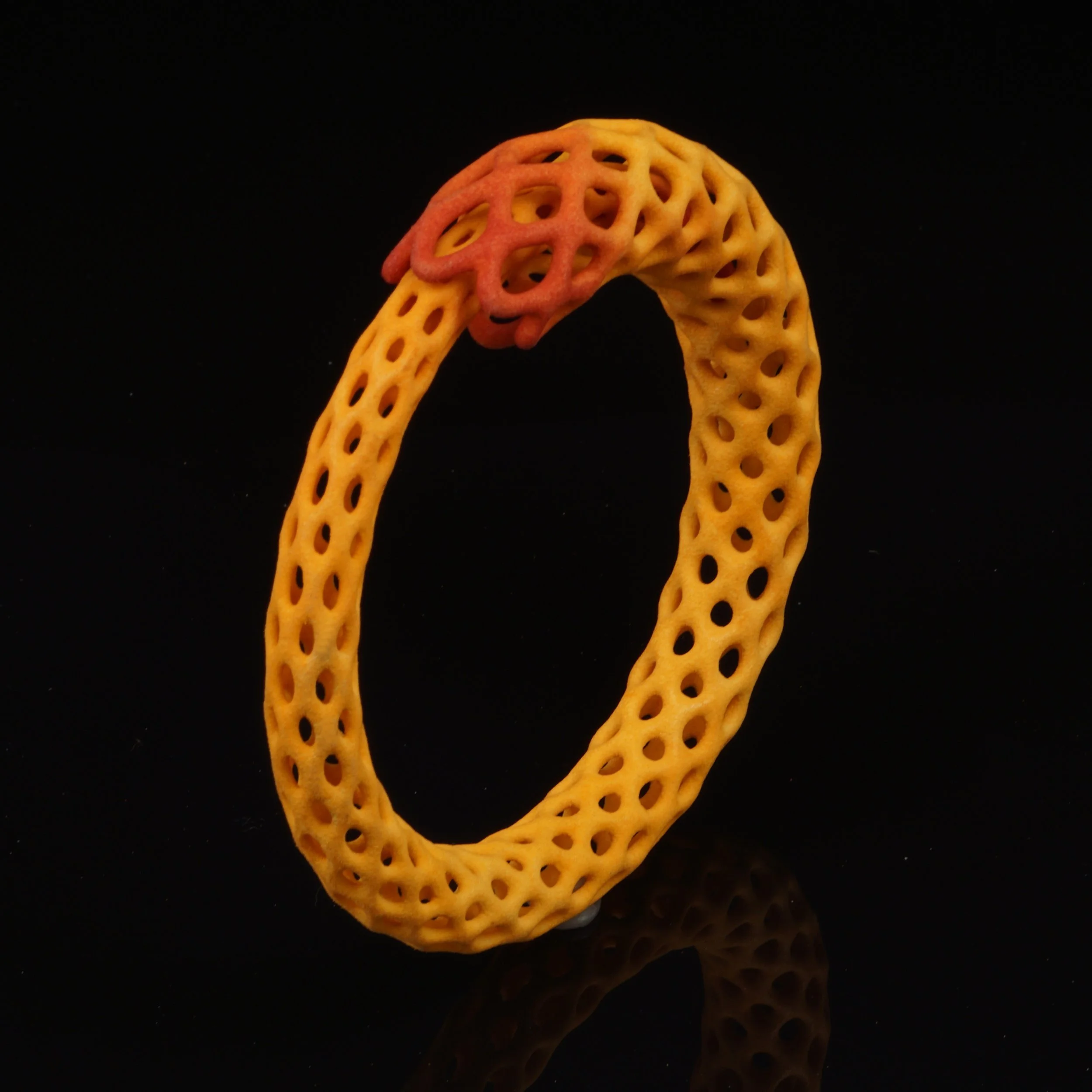 Picking up on an ancient archetype of the ouroboros, a symbol of perpetual change, this bracelet feeds back into itself. This acts as a mechanism for opening the bracelet - simple pull to enlarge the circle and put the bracelet on, and it snaps back to shape when released. 3D printed from nylon, and dyed with a red-orange color fade.